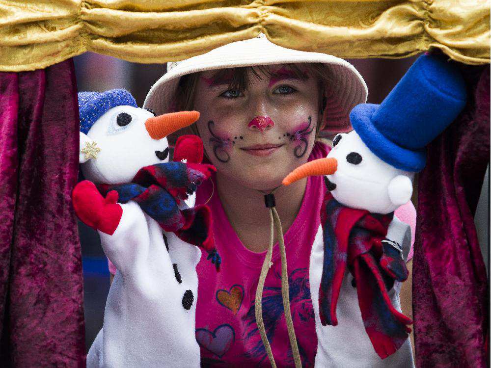 At the Artelle booth, kids and parents also enjoyed performing mini shows for each other at our table-top stage, a popular attraction for puppeteers of all ages. In the photo below, the Mr. & Mrs. Snowman hand-puppets made by Peggy Artelle are helping a young lady to put on a show at our booth during the festival.